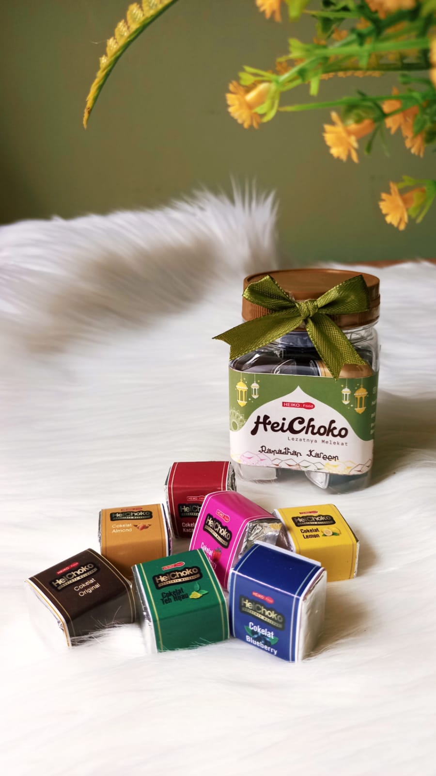 HeiChoko Coklat Cube Kemasan Botol juga hadir dalam edisi lebaran yang berisi 13 cube aneka rasa. HeiChoko botol memiliki kemasan unik yang bisa digunakan kembali (reuse) sebagai tempat bumbu dan lainnya.