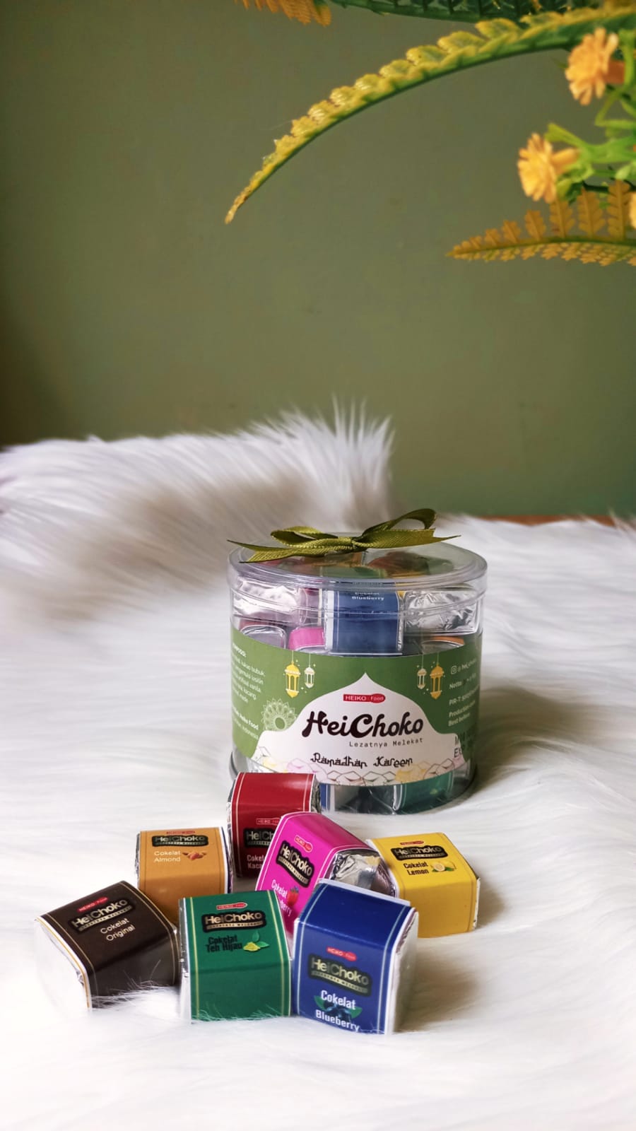 HeiChoko Coklat Cube Kemasan Tabung Mika terdiri dari Tabung Kecil (berisi 28 cube coklat aneka rasa) dan Tabung Tinggi (berisi 50 cube coklat aneka rasa). Heichoko tabung hadir dengan tampilan khusus untuk menemani lebaran kalian nih, dengan desain yang cantik dan menarik. Cocok sebagai camilan, atau suguhan di meja untuk halal bihalal.